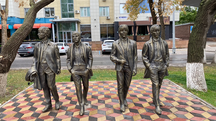 Astana, Kazakhstan.  In a small park in the capital city of Kazakhstan, you find this tribute in bronze to The Beatles.  It turns out the Fab Four are immensely popular here in Central Asia.  Young and old, they sing and dance to Beatle music.  The Beatles may be ancient history for American kids, but Beatlemania is very much alive for Kazakh, Kyrgyz, and Uzbek kids in what us for us a remote world.  (Glimpses of Our Breathtaking World #313 photo ©Jack Wheeler)