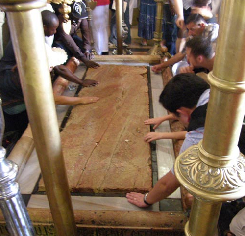 the-stone-of-anointingThe holiest place in Christianity is the Church of the Holy Sepulchre in Old Jerusalem, built by Constantine in 435 over the site of Christ’s crucifixion on the hill of Golgotha. Upon entering, you immediately see displayed the Stone of Anointing, a slab of limestone traditionally revered as where Jesus’ body was laid after taken down from the Cross, and prepared for burial by Joseph of Arimathea and Nicodemus.